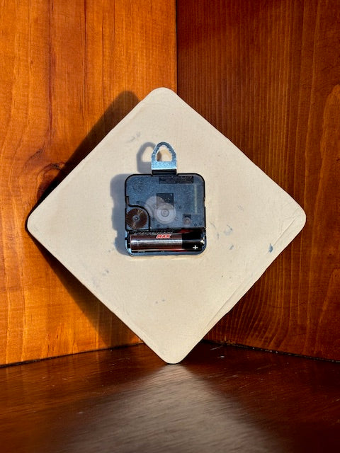 This clock is made out of B-mix clay, hand rolled and stamped with a paisley pattern and numbers. When mounted, the clock sticks out about an inch from the wall. AA Battery operated.